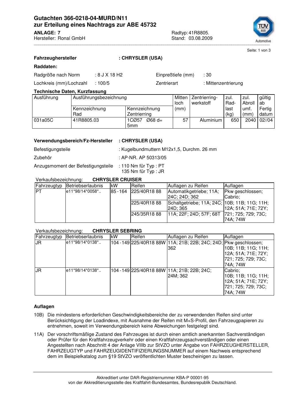Dieses Gutachten (abe) bezieht sich auf die Alufelge brand-ronal 41R8805 in der Ausführung 8Jx18 ET 0, Mittenloch 0 mm (KBA 45732). Im PDF findest du typischerweise zulässige Reifengrößen, Auflagen/Anbauhinweise und – je nach Dokument – Hinweise zur Eintragung.