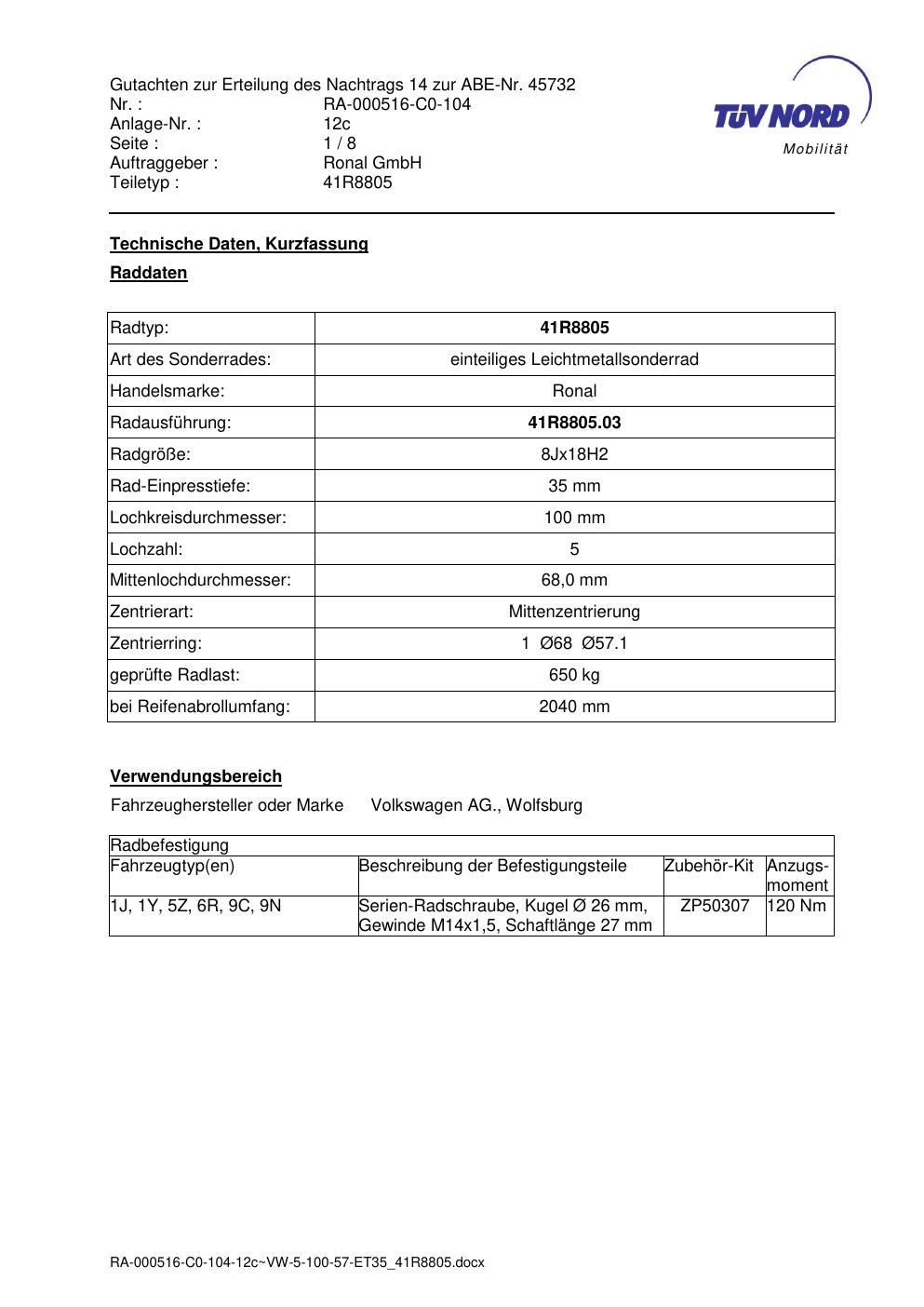 Dieses Gutachten (abe) bezieht sich auf die Alufelge brand-ronal 41R8805 in der Ausführung 8Jx18 ET 0, Mittenloch 0 mm (KBA 45732). Im PDF findest du typischerweise zulässige Reifengrößen, Auflagen/Anbauhinweise und – je nach Dokument – Hinweise zur Eintragung.
