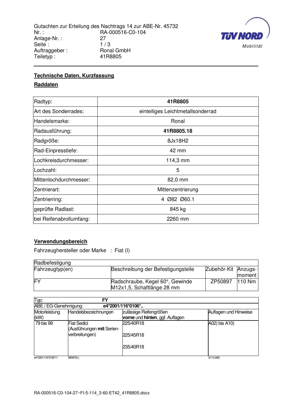 Dieses Gutachten (abe) bezieht sich auf die Alufelge brand-ronal 41R8805 in der Ausführung 8Jx18 ET 0, Mittenloch 0 mm (KBA 45732). Im PDF findest du typischerweise zulässige Reifengrößen, Auflagen/Anbauhinweise und – je nach Dokument – Hinweise zur Eintragung.