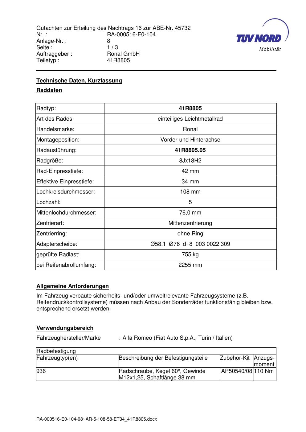 Dieses Gutachten (abe) bezieht sich auf die Alufelge brand-ronal 41R8805 in der Ausführung 8Jx18 ET 0, Mittenloch 0 mm (KBA 45732). Im PDF findest du typischerweise zulässige Reifengrößen, Auflagen/Anbauhinweise und – je nach Dokument – Hinweise zur Eintragung.