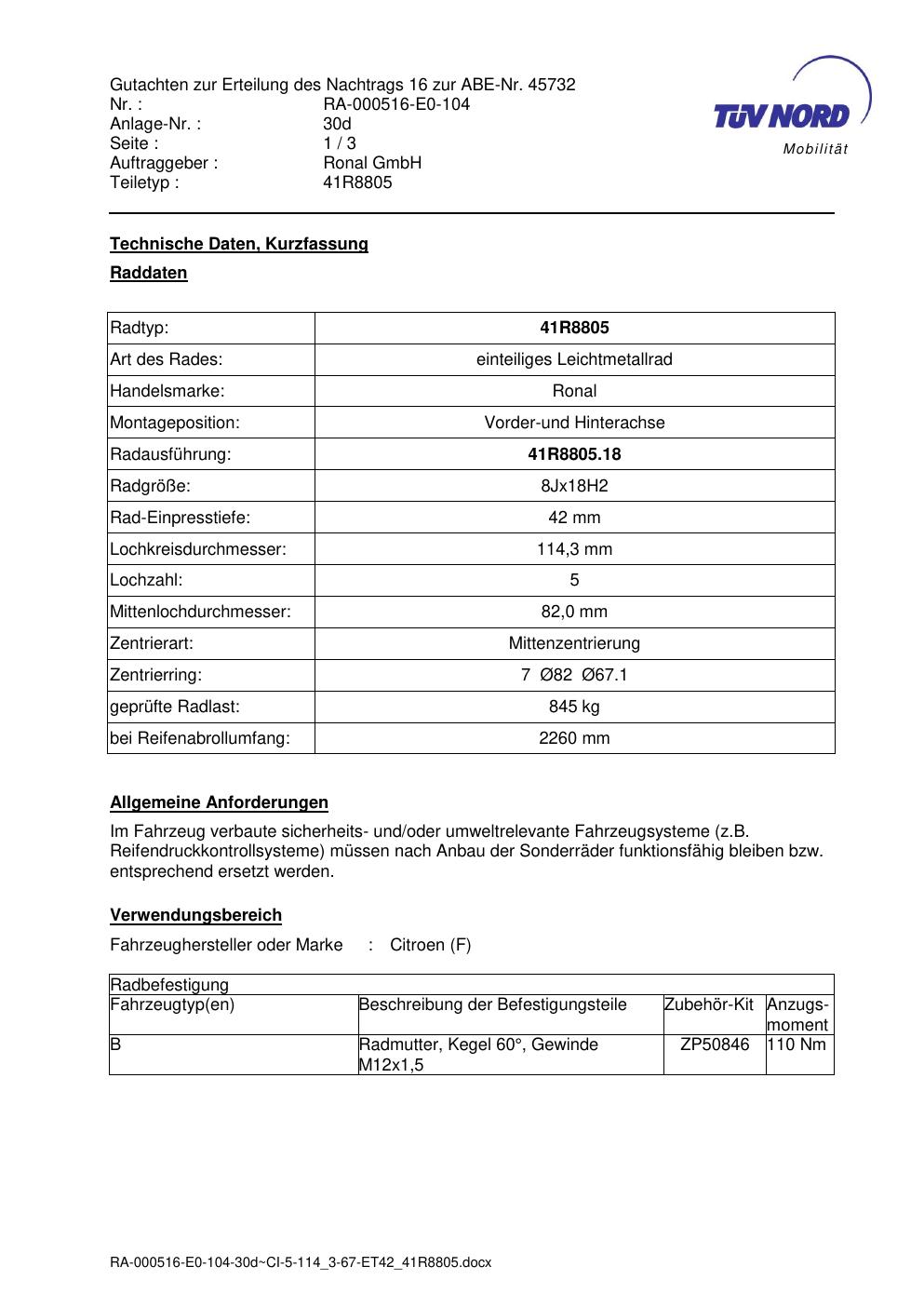 Dieses Gutachten (abe) bezieht sich auf die Alufelge brand-ronal 41R8805 in der Ausführung 8Jx18 ET 0, Mittenloch 0 mm (KBA 45732). Im PDF findest du typischerweise zulässige Reifengrößen, Auflagen/Anbauhinweise und – je nach Dokument – Hinweise zur Eintragung.