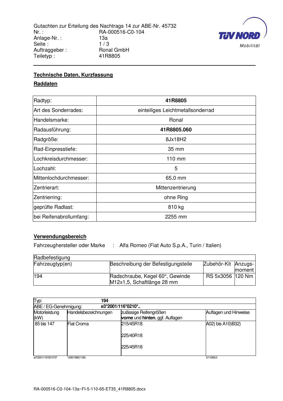 Dieses Gutachten (abe) bezieht sich auf die Alufelge brand-ronal 41R8805 in der Ausführung 8Jx18 ET 0, Mittenloch 0 mm (KBA 45732). Im PDF findest du typischerweise zulässige Reifengrößen, Auflagen/Anbauhinweise und – je nach Dokument – Hinweise zur Eintragung.