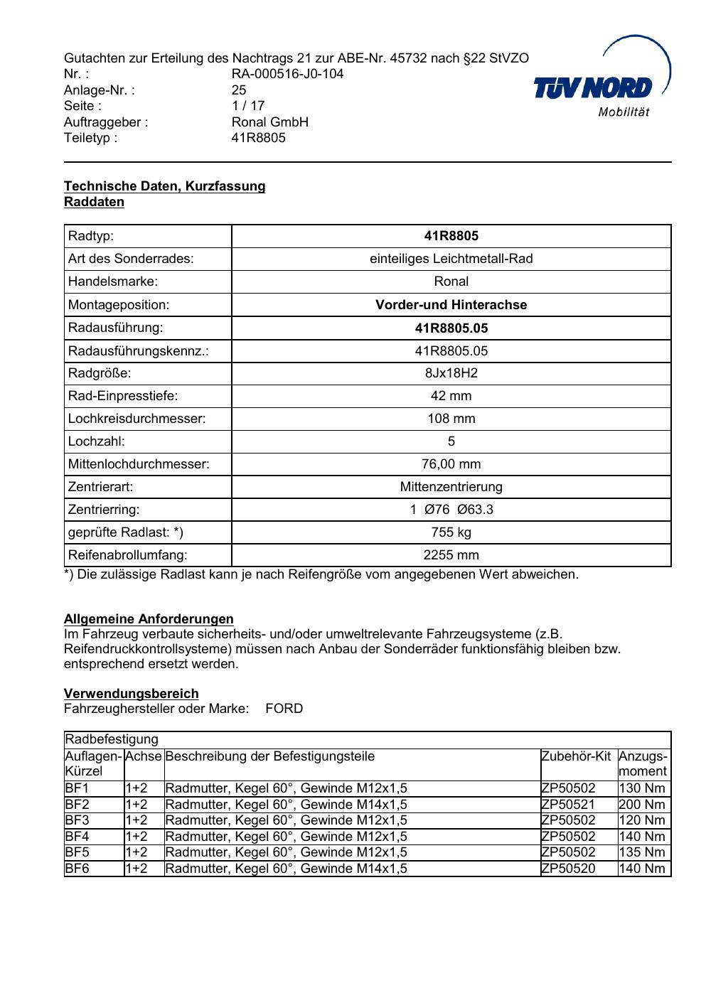 Dieses Gutachten (abe) bezieht sich auf die Alufelge brand-ronal 41R8805 in der Ausführung 8Jx18 ET 0, Mittenloch 0 mm (KBA 45732). Im PDF findest du typischerweise zulässige Reifengrößen, Auflagen/Anbauhinweise und – je nach Dokument – Hinweise zur Eintragung.