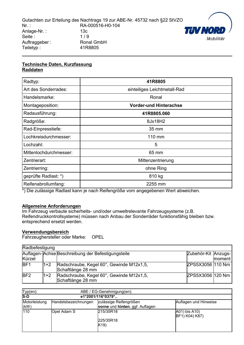 Dieses Gutachten (abe) bezieht sich auf die Alufelge brand-ronal 41R8805 in der Ausführung 8Jx18 ET 0, Mittenloch 0 mm (KBA 45732). Im PDF findest du typischerweise zulässige Reifengrößen, Auflagen/Anbauhinweise und – je nach Dokument – Hinweise zur Eintragung.