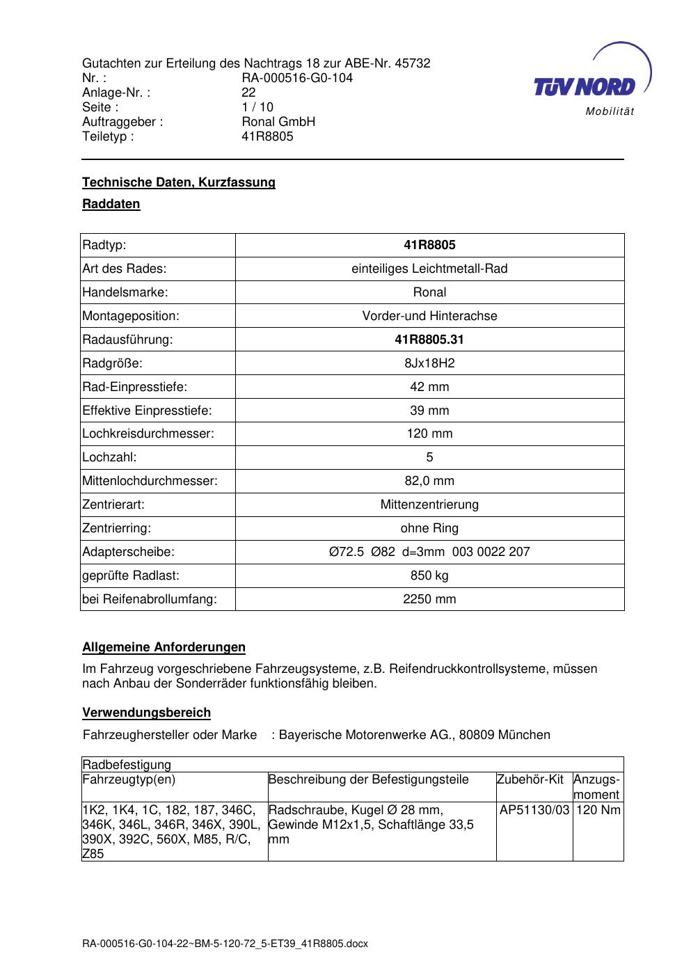 Dieses Gutachten (abe) bezieht sich auf die Alufelge brand-ronal 41R8805 in der Ausführung 8Jx18 ET 0, Mittenloch 0 mm (KBA 45732). Im PDF findest du typischerweise zulässige Reifengrößen, Auflagen/Anbauhinweise und – je nach Dokument – Hinweise zur Eintragung.