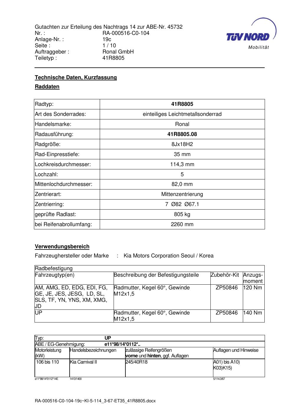 Dieses Gutachten (abe) bezieht sich auf die Alufelge brand-ronal 41R8805 in der Ausführung 8Jx18 ET 0, Mittenloch 0 mm (KBA 45732). Im PDF findest du typischerweise zulässige Reifengrößen, Auflagen/Anbauhinweise und – je nach Dokument – Hinweise zur Eintragung.