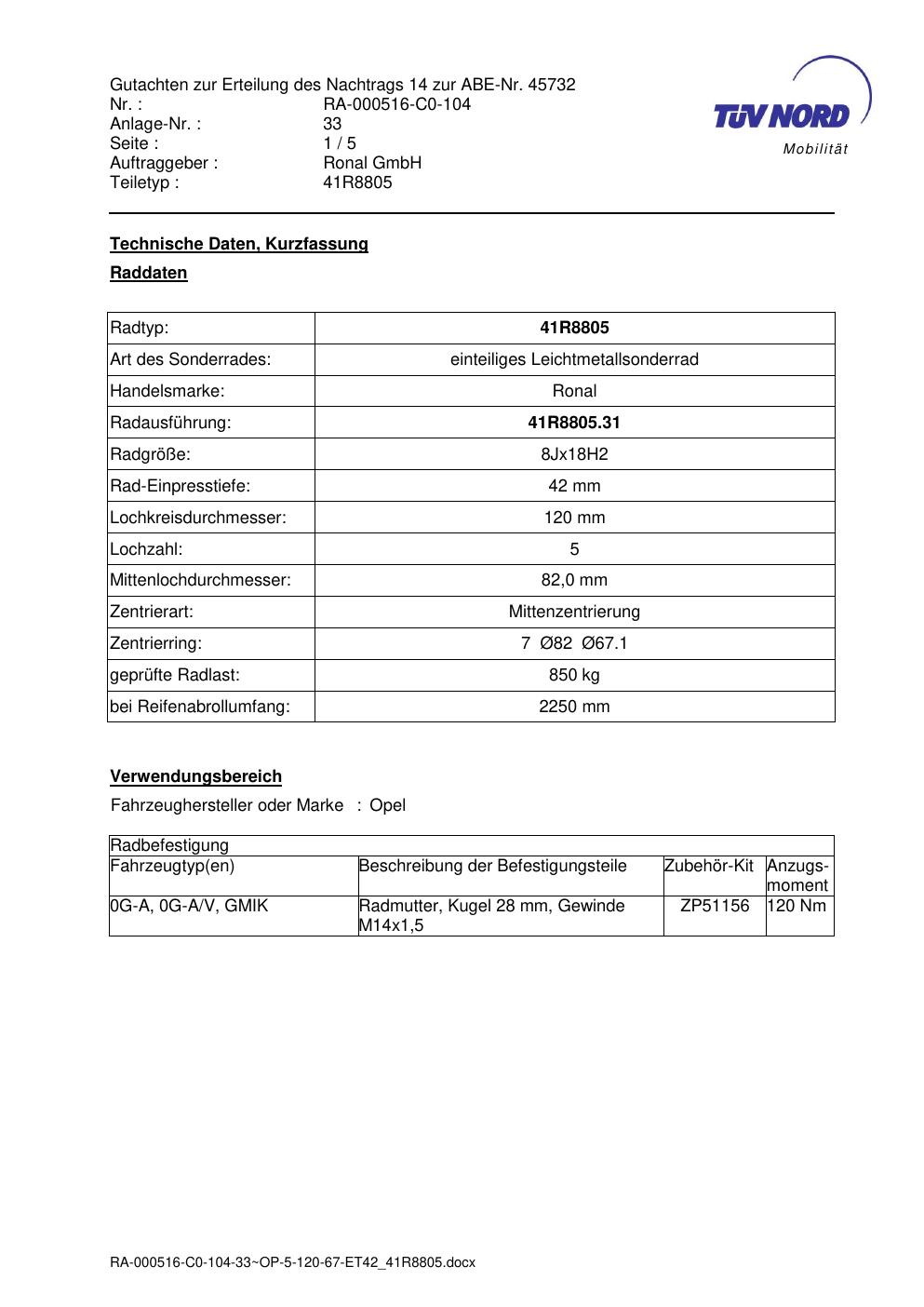 Dieses Gutachten (abe) bezieht sich auf die Alufelge brand-ronal 41R8805 in der Ausführung 8Jx18 ET 0, Mittenloch 0 mm (KBA 45732). Im PDF findest du typischerweise zulässige Reifengrößen, Auflagen/Anbauhinweise und – je nach Dokument – Hinweise zur Eintragung.