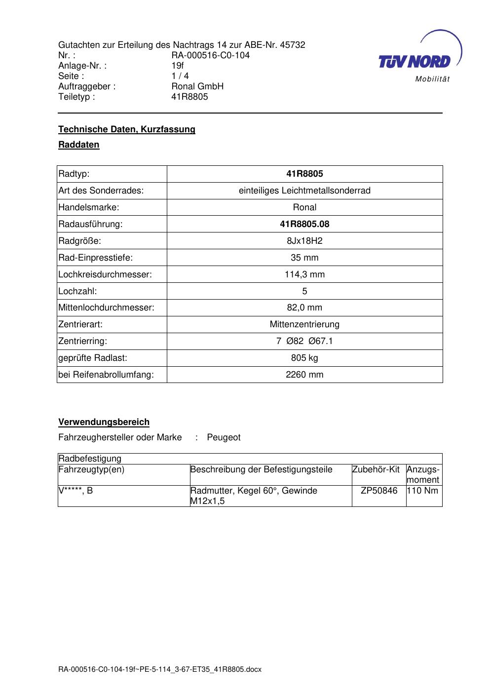 Dieses Gutachten (abe) bezieht sich auf die Alufelge brand-ronal 41R8805 in der Ausführung 8Jx18 ET 0, Mittenloch 0 mm (KBA 45732). Im PDF findest du typischerweise zulässige Reifengrößen, Auflagen/Anbauhinweise und – je nach Dokument – Hinweise zur Eintragung.