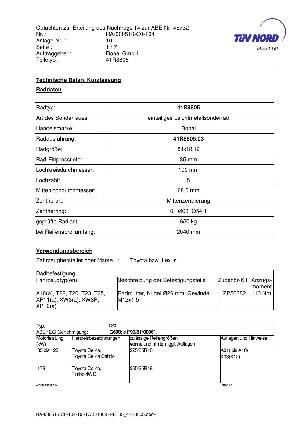 Dieses Gutachten (abe) bezieht sich auf die Alufelge brand-ronal 41R8805 in der Ausführung 8Jx18 ET 0, Mittenloch 0 mm (KBA 45732). Im PDF findest du typischerweise zulässige Reifengrößen, Auflagen/Anbauhinweise und – je nach Dokument – Hinweise zur Eintragung.