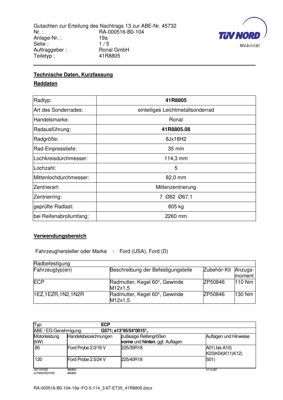 Dieses Gutachten (abe) bezieht sich auf die Alufelge brand-ronal 41R8805 in der Ausführung 8Jx18 ET 0, Mittenloch 0 mm (KBA 45732). Im PDF findest du typischerweise zulässige Reifengrößen, Auflagen/Anbauhinweise und – je nach Dokument – Hinweise zur Eintragung.