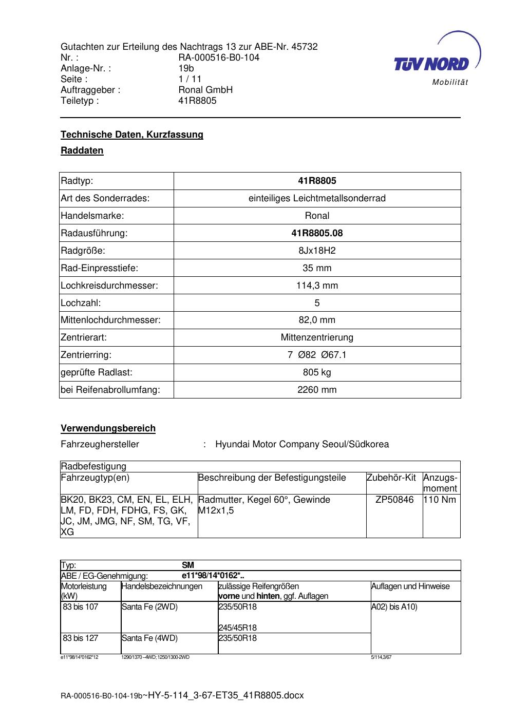 Dieses Gutachten (abe) bezieht sich auf die Alufelge brand-ronal 41R8805 in der Ausführung 8Jx18 ET 0, Mittenloch 0 mm (KBA 45732). Im PDF findest du typischerweise zulässige Reifengrößen, Auflagen/Anbauhinweise und – je nach Dokument – Hinweise zur Eintragung.