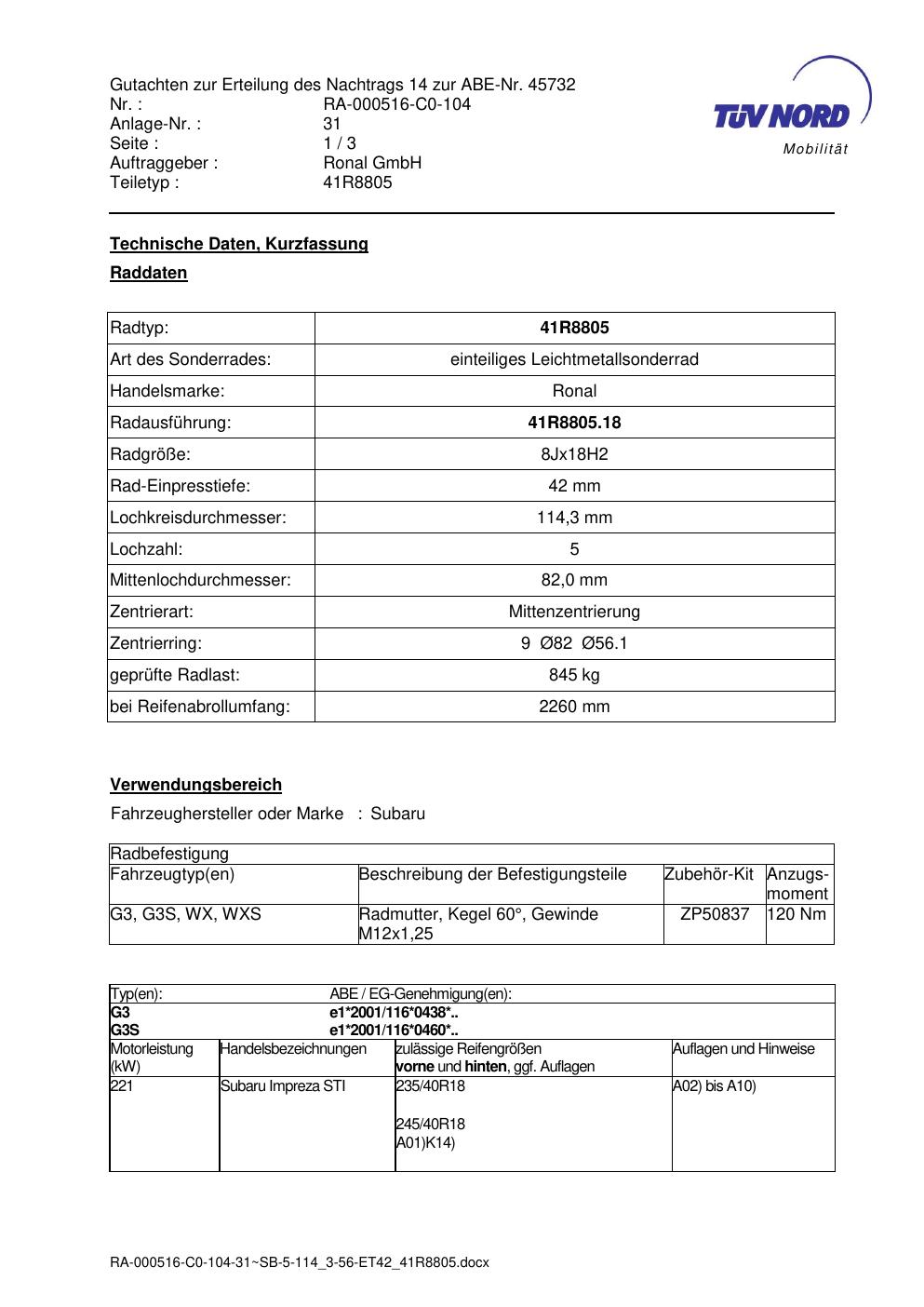 Dieses Gutachten (abe) bezieht sich auf die Alufelge brand-ronal 41R8805 in der Ausführung 8Jx18 ET 0, Mittenloch 0 mm (KBA 45732). Im PDF findest du typischerweise zulässige Reifengrößen, Auflagen/Anbauhinweise und – je nach Dokument – Hinweise zur Eintragung.