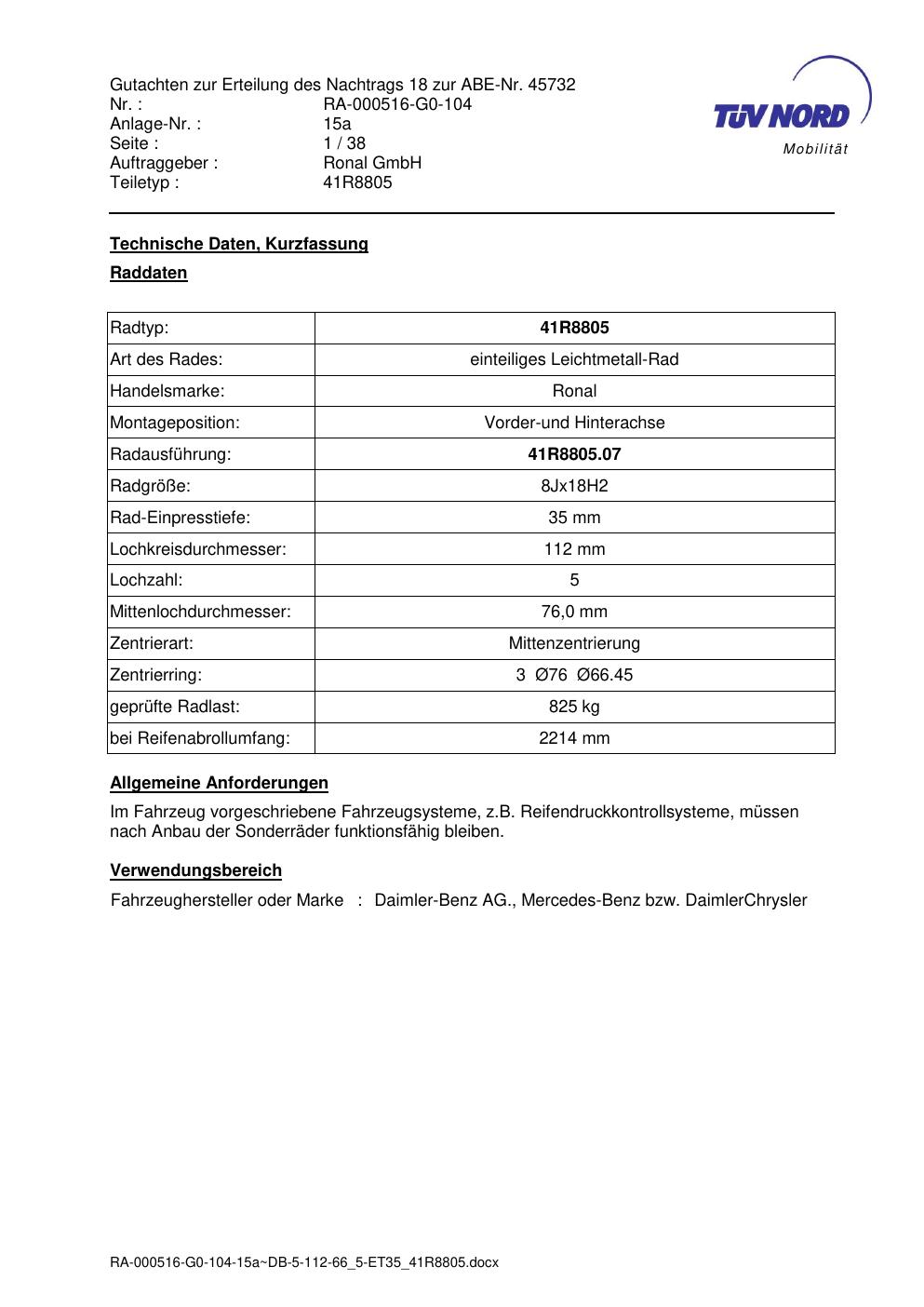 Dieses Gutachten (abe) bezieht sich auf die Alufelge brand-ronal 41R8805 in der Ausführung 8Jx18 ET 0, Mittenloch 0 mm (KBA 45732). Im PDF findest du typischerweise zulässige Reifengrößen, Auflagen/Anbauhinweise und – je nach Dokument – Hinweise zur Eintragung.