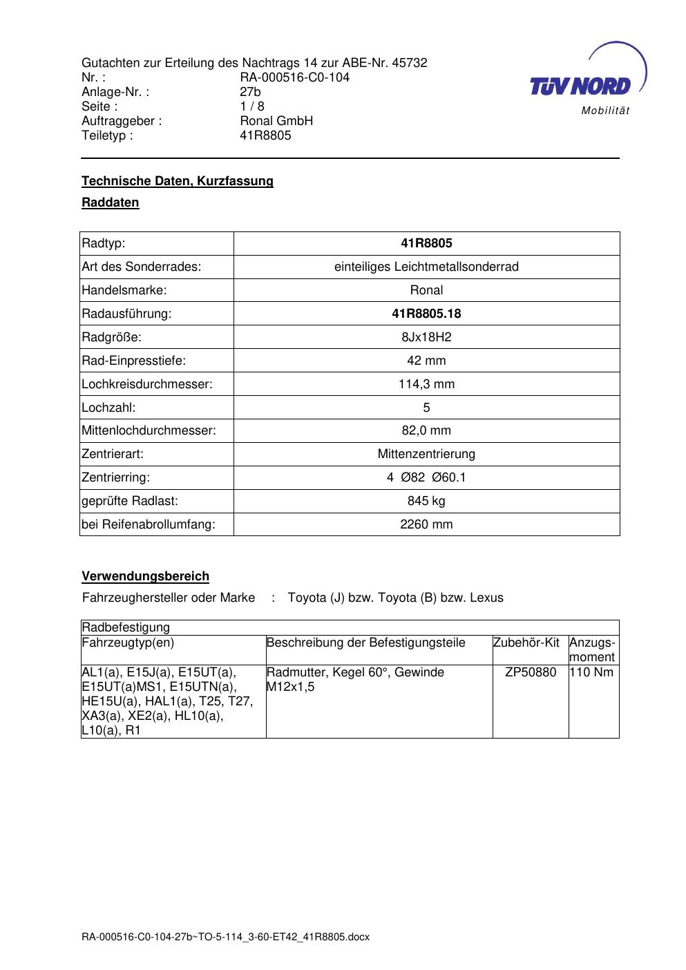Dieses Gutachten (abe) bezieht sich auf die Alufelge brand-ronal 41R8805 in der Ausführung 8Jx18 ET 0, Mittenloch 0 mm (KBA 45732). Im PDF findest du typischerweise zulässige Reifengrößen, Auflagen/Anbauhinweise und – je nach Dokument – Hinweise zur Eintragung.
