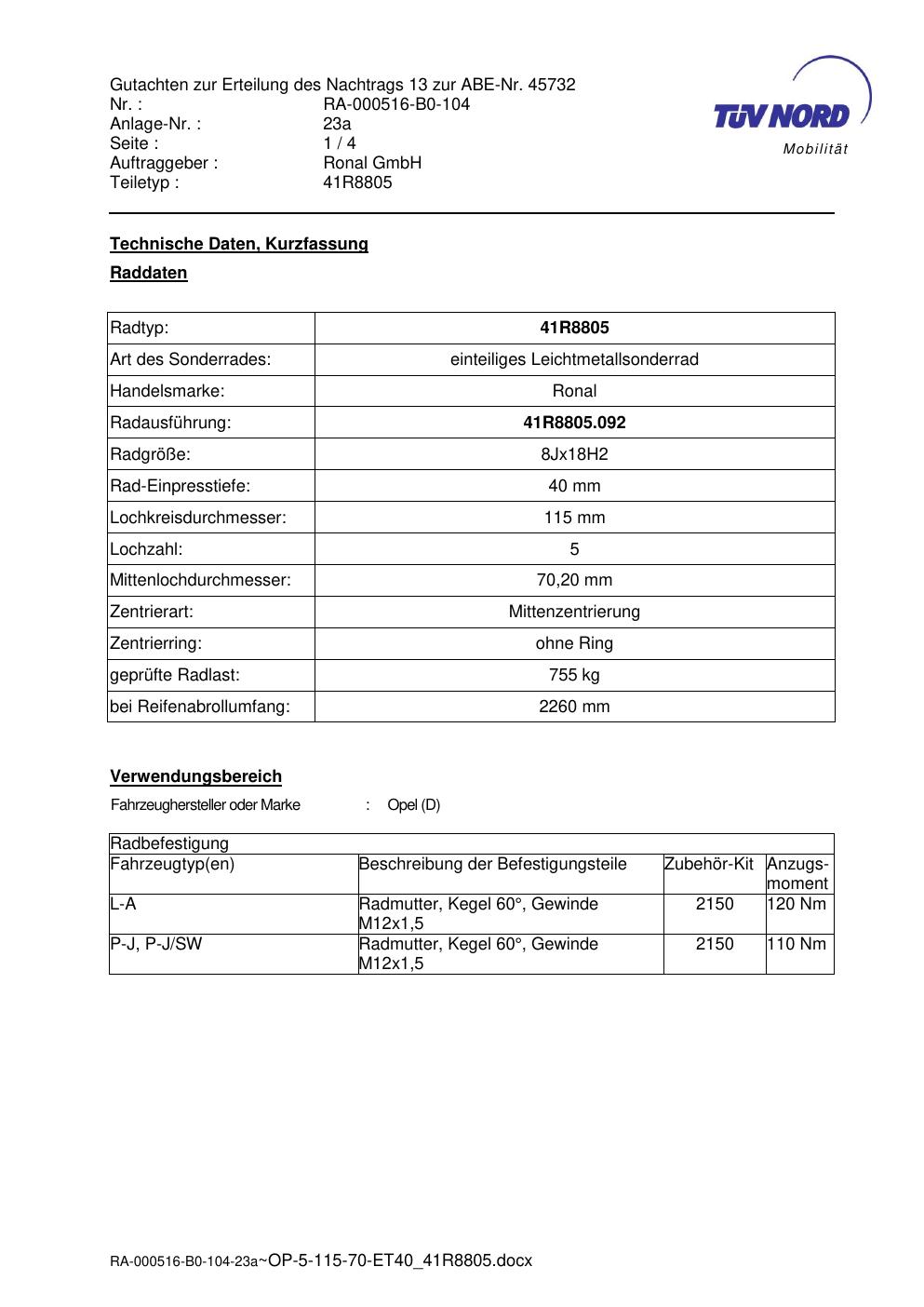 Dieses Gutachten (abe) bezieht sich auf die Alufelge brand-ronal 41R8805 in der Ausführung 8Jx18 ET 0, Mittenloch 0 mm (KBA 45732). Im PDF findest du typischerweise zulässige Reifengrößen, Auflagen/Anbauhinweise und – je nach Dokument – Hinweise zur Eintragung.