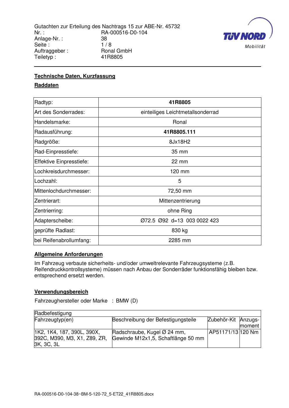 Dieses Gutachten (abe) bezieht sich auf die Alufelge brand-ronal 41R8805 in der Ausführung 8Jx18 ET 0, Mittenloch 0 mm (KBA 45732). Im PDF findest du typischerweise zulässige Reifengrößen, Auflagen/Anbauhinweise und – je nach Dokument – Hinweise zur Eintragung.