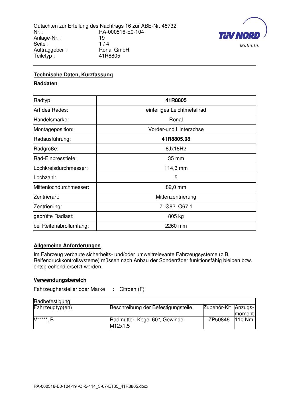 Dieses Gutachten (abe) bezieht sich auf die Alufelge brand-ronal 41R8805 in der Ausführung 8Jx18 ET 0, Mittenloch 0 mm (KBA 45732). Im PDF findest du typischerweise zulässige Reifengrößen, Auflagen/Anbauhinweise und – je nach Dokument – Hinweise zur Eintragung.