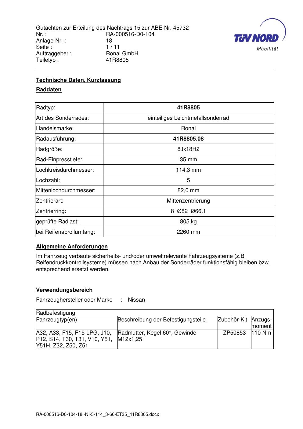 Dieses Gutachten (abe) bezieht sich auf die Alufelge brand-ronal 41R8805 in der Ausführung 8Jx18 ET 0, Mittenloch 0 mm (KBA 45732). Im PDF findest du typischerweise zulässige Reifengrößen, Auflagen/Anbauhinweise und – je nach Dokument – Hinweise zur Eintragung.