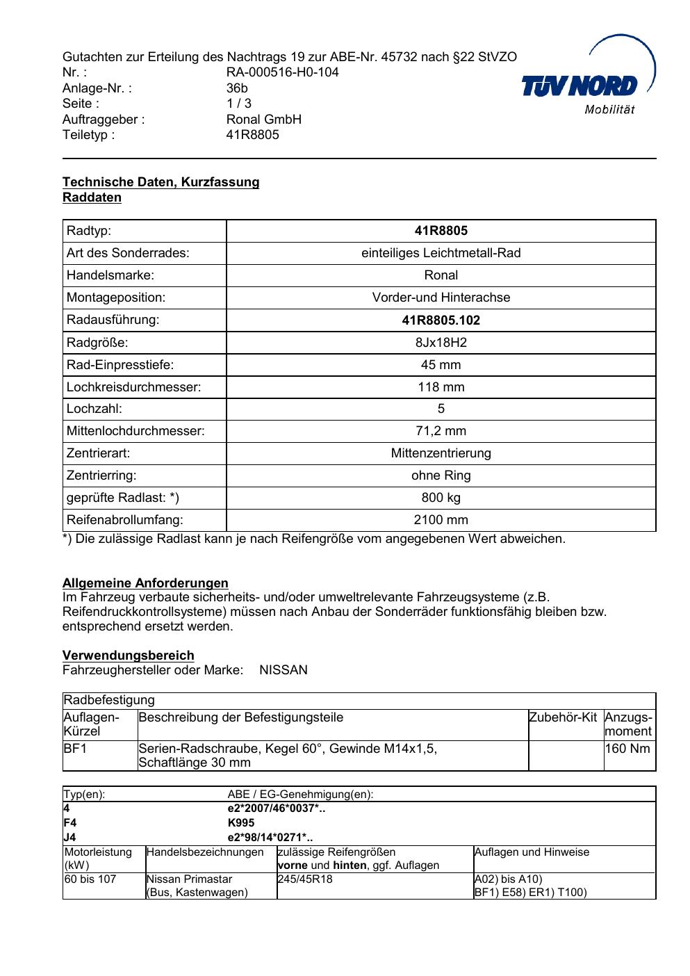 Dieses Gutachten (abe) bezieht sich auf die Alufelge brand-ronal 41R8805 in der Ausführung 8Jx18 ET 0, Mittenloch 0 mm (KBA 45732). Im PDF findest du typischerweise zulässige Reifengrößen, Auflagen/Anbauhinweise und – je nach Dokument – Hinweise zur Eintragung.