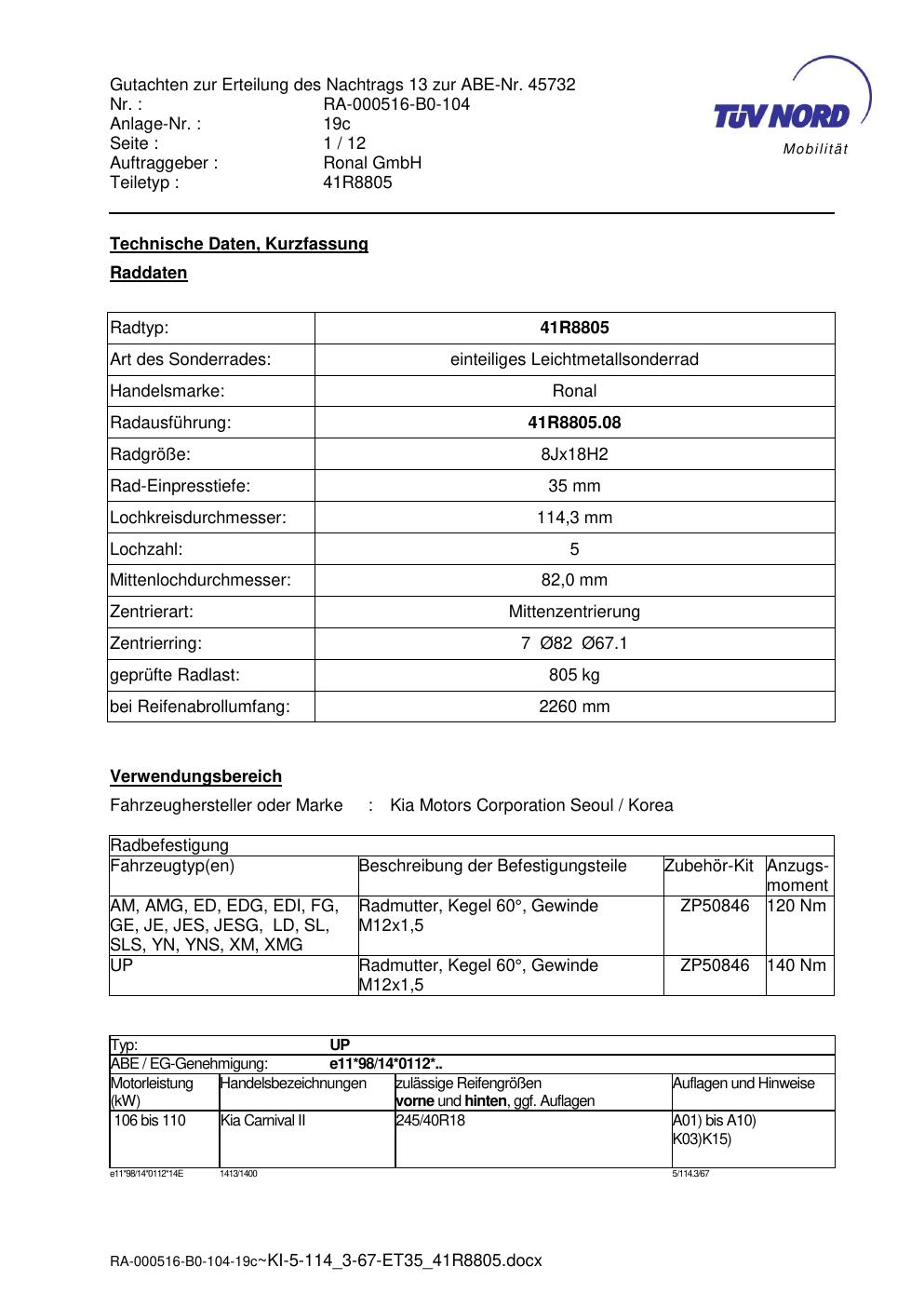 Dieses Gutachten (abe) bezieht sich auf die Alufelge brand-ronal 41R8805 in der Ausführung 8Jx18 ET 0, Mittenloch 0 mm (KBA 45732). Im PDF findest du typischerweise zulässige Reifengrößen, Auflagen/Anbauhinweise und – je nach Dokument – Hinweise zur Eintragung.