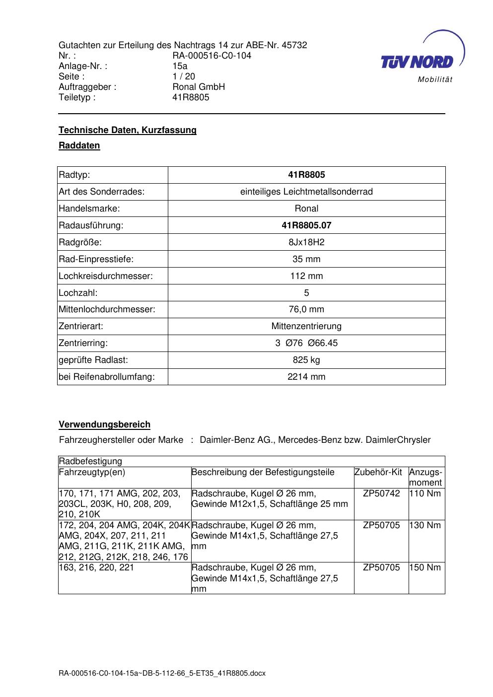 Dieses Gutachten (abe) bezieht sich auf die Alufelge brand-ronal 41R8805 in der Ausführung 8Jx18 ET 0, Mittenloch 0 mm (KBA 45732). Im PDF findest du typischerweise zulässige Reifengrößen, Auflagen/Anbauhinweise und – je nach Dokument – Hinweise zur Eintragung.