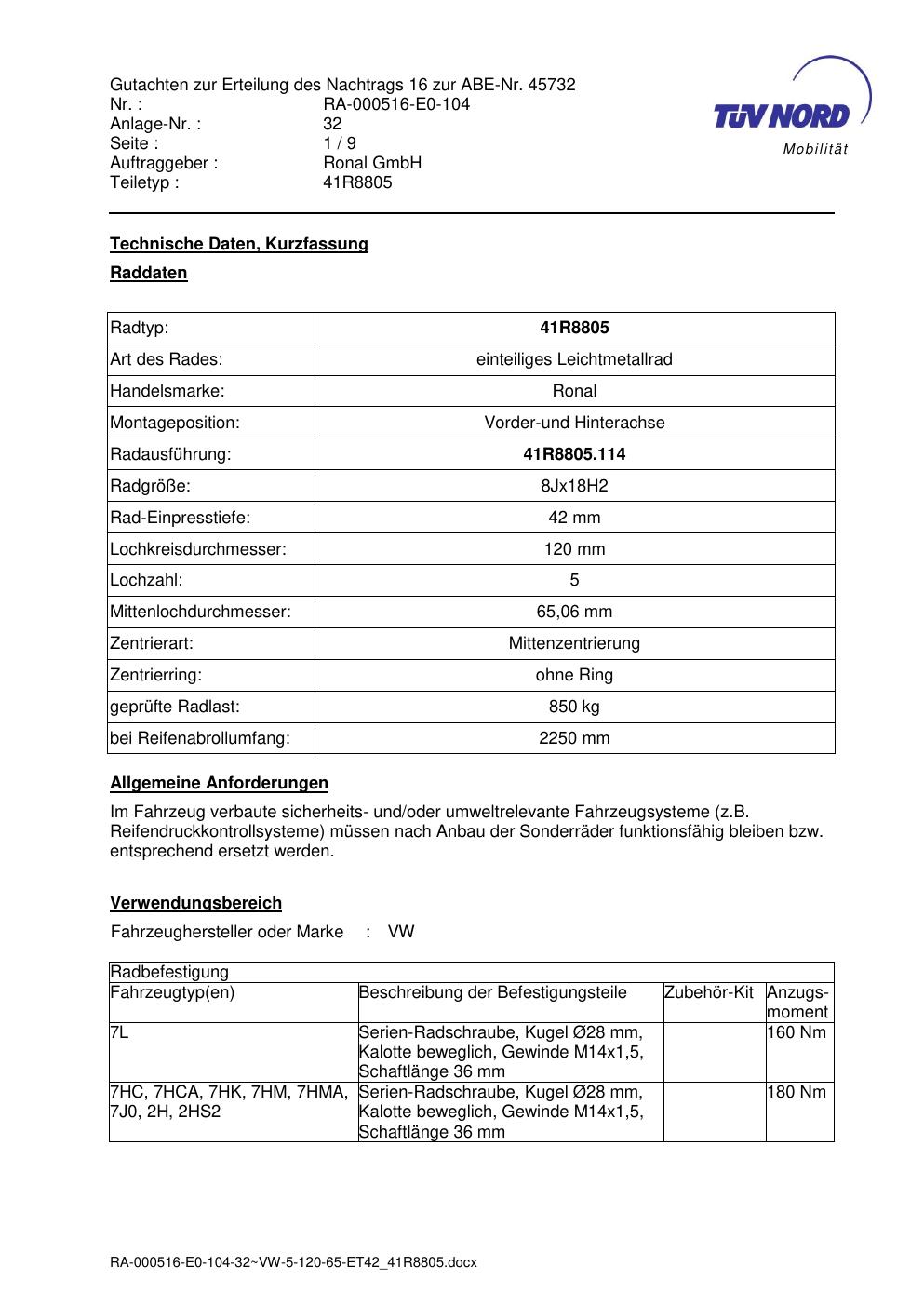 Dieses Gutachten (abe) bezieht sich auf die Alufelge brand-ronal 41R8805 in der Ausführung 8Jx18 ET 0, Mittenloch 0 mm (KBA 45732). Im PDF findest du typischerweise zulässige Reifengrößen, Auflagen/Anbauhinweise und – je nach Dokument – Hinweise zur Eintragung.