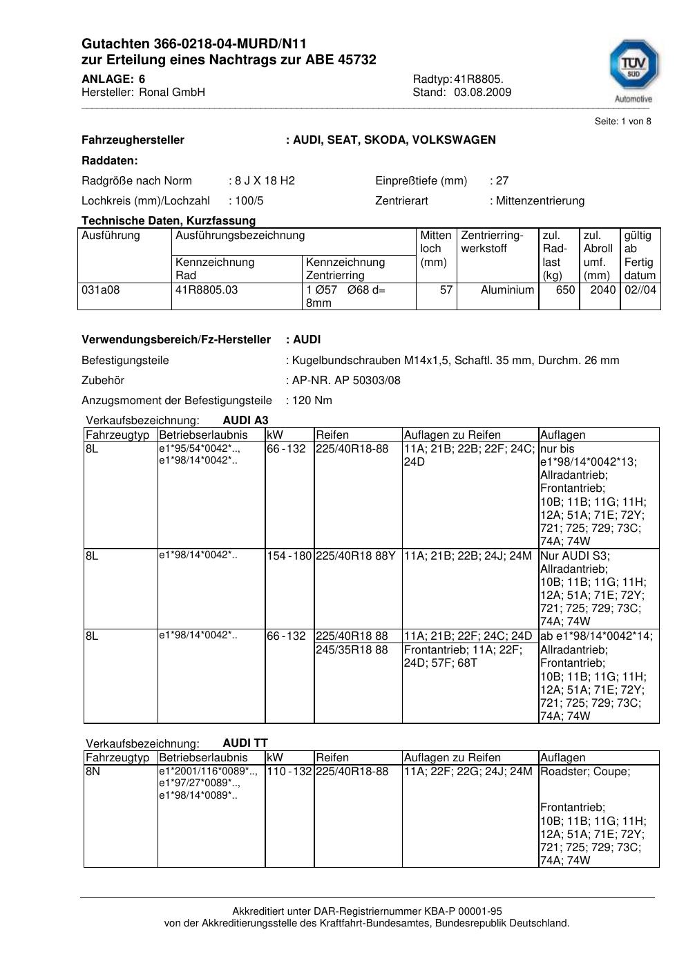 Dieses Gutachten (abe) bezieht sich auf die Alufelge brand-ronal 41R8805 in der Ausführung 8Jx18 ET 0, Mittenloch 0 mm (KBA 45732). Im PDF findest du typischerweise zulässige Reifengrößen, Auflagen/Anbauhinweise und – je nach Dokument – Hinweise zur Eintragung.