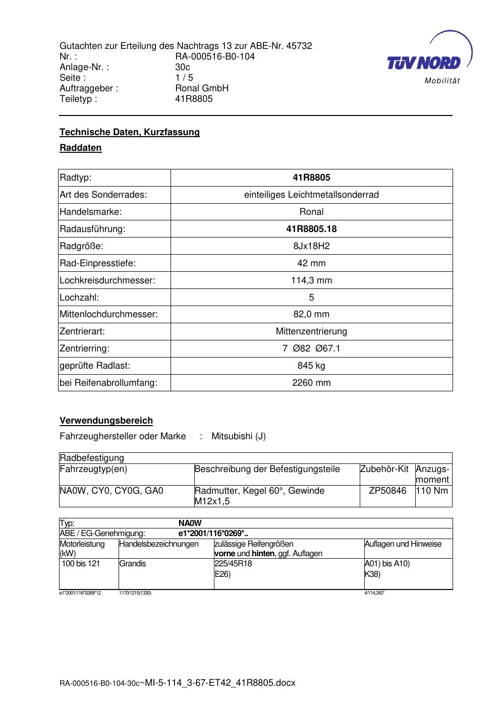 Dieses Gutachten (abe) bezieht sich auf die Alufelge brand-ronal 41R8805 in der Ausführung 8Jx18 ET 0, Mittenloch 0 mm (KBA 45732). Im PDF findest du typischerweise zulässige Reifengrößen, Auflagen/Anbauhinweise und – je nach Dokument – Hinweise zur Eintragung.