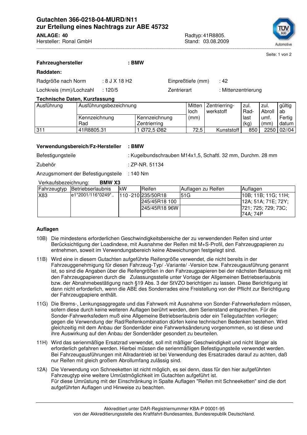Dieses Gutachten (abe) bezieht sich auf die Alufelge Ronal 41R8805 in der Ausführung 8Jx18 ET 0, Mittenloch 0 mm (KBA 45732). Im PDF findest du typischerweise zulässige Reifengrößen, Auflagen/Anbauhinweise und – je nach Dokument – Hinweise zur Eintragung.