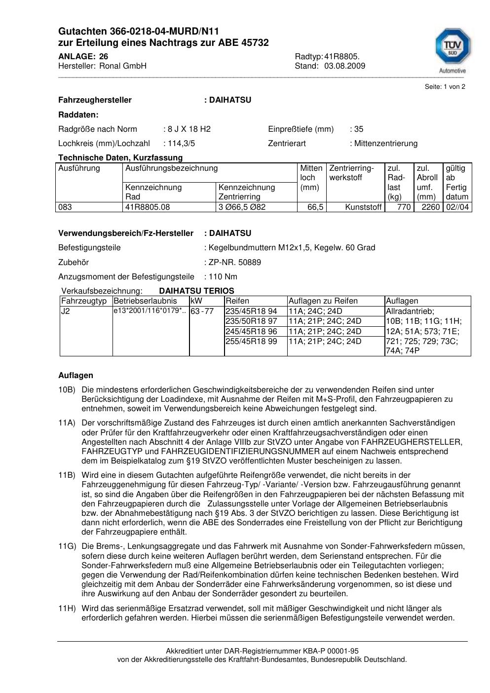 Dieses Gutachten (abe) bezieht sich auf die Alufelge Ronal 41R8805 in der Ausführung 8Jx18 ET 0, Mittenloch 0 mm (KBA 45732). Im PDF findest du typischerweise zulässige Reifengrößen, Auflagen/Anbauhinweise und – je nach Dokument – Hinweise zur Eintragung.