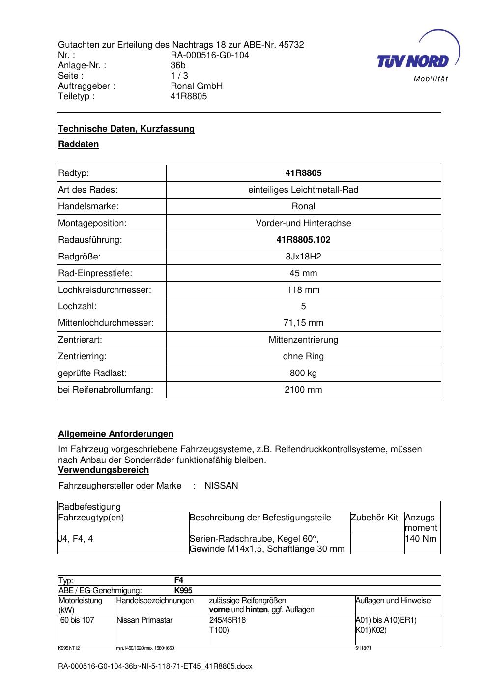Dieses Gutachten (abe) bezieht sich auf die Alufelge brand-ronal 41R8805 in der Ausführung 8Jx18 ET 0, Mittenloch 0 mm (KBA 45732). Im PDF findest du typischerweise zulässige Reifengrößen, Auflagen/Anbauhinweise und – je nach Dokument – Hinweise zur Eintragung.