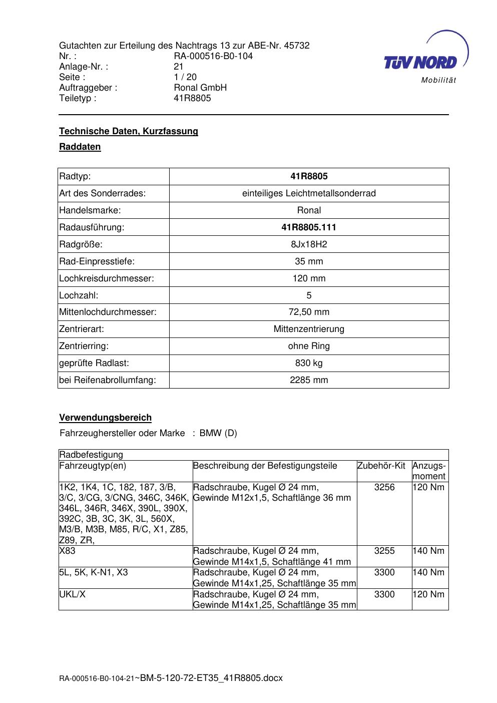 Dieses Gutachten (abe) bezieht sich auf die Alufelge brand-ronal 41R8805 in der Ausführung 8Jx18 ET 0, Mittenloch 0 mm (KBA 45732). Im PDF findest du typischerweise zulässige Reifengrößen, Auflagen/Anbauhinweise und – je nach Dokument – Hinweise zur Eintragung.