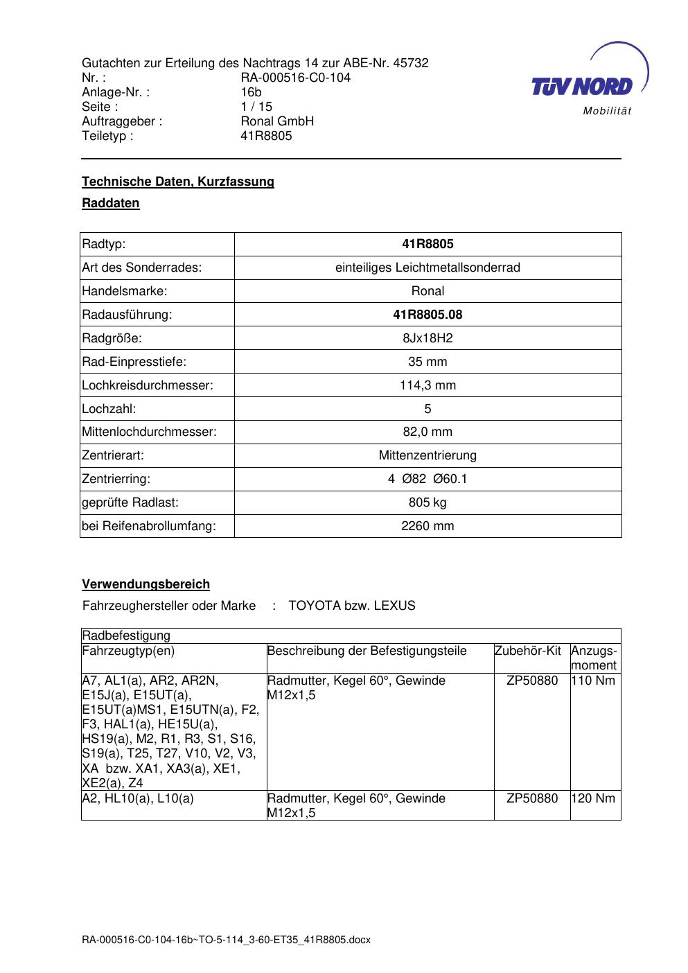 Dieses Gutachten (abe) bezieht sich auf die Alufelge brand-ronal 41R8805 in der Ausführung 8Jx18 ET 0, Mittenloch 0 mm (KBA 45732). Im PDF findest du typischerweise zulässige Reifengrößen, Auflagen/Anbauhinweise und – je nach Dokument – Hinweise zur Eintragung.