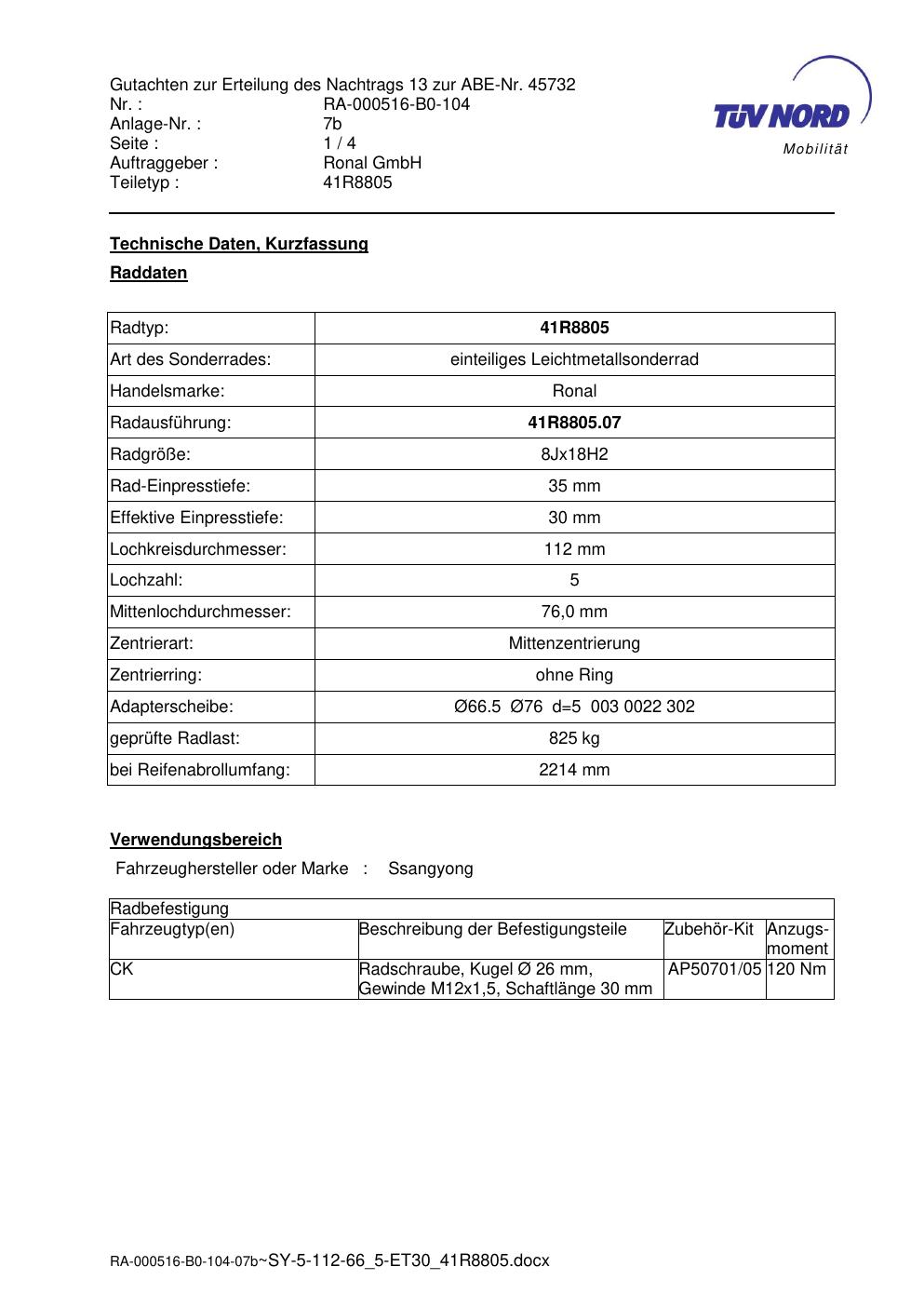 Dieses Gutachten (abe) bezieht sich auf die Alufelge brand-ronal 41R8805 in der Ausführung 8Jx18 ET 0, Mittenloch 0 mm (KBA 45732). Im PDF findest du typischerweise zulässige Reifengrößen, Auflagen/Anbauhinweise und – je nach Dokument – Hinweise zur Eintragung.