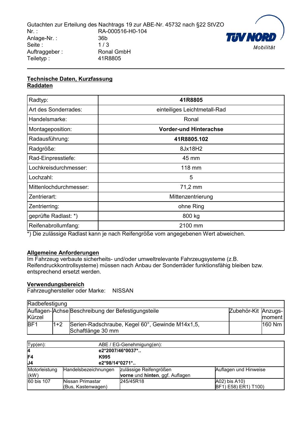 Dieses Gutachten (abe) bezieht sich auf die Alufelge brand-ronal 41R8805 in der Ausführung 8Jx18 ET 0, Mittenloch 0 mm (KBA 45732). Im PDF findest du typischerweise zulässige Reifengrößen, Auflagen/Anbauhinweise und – je nach Dokument – Hinweise zur Eintragung.