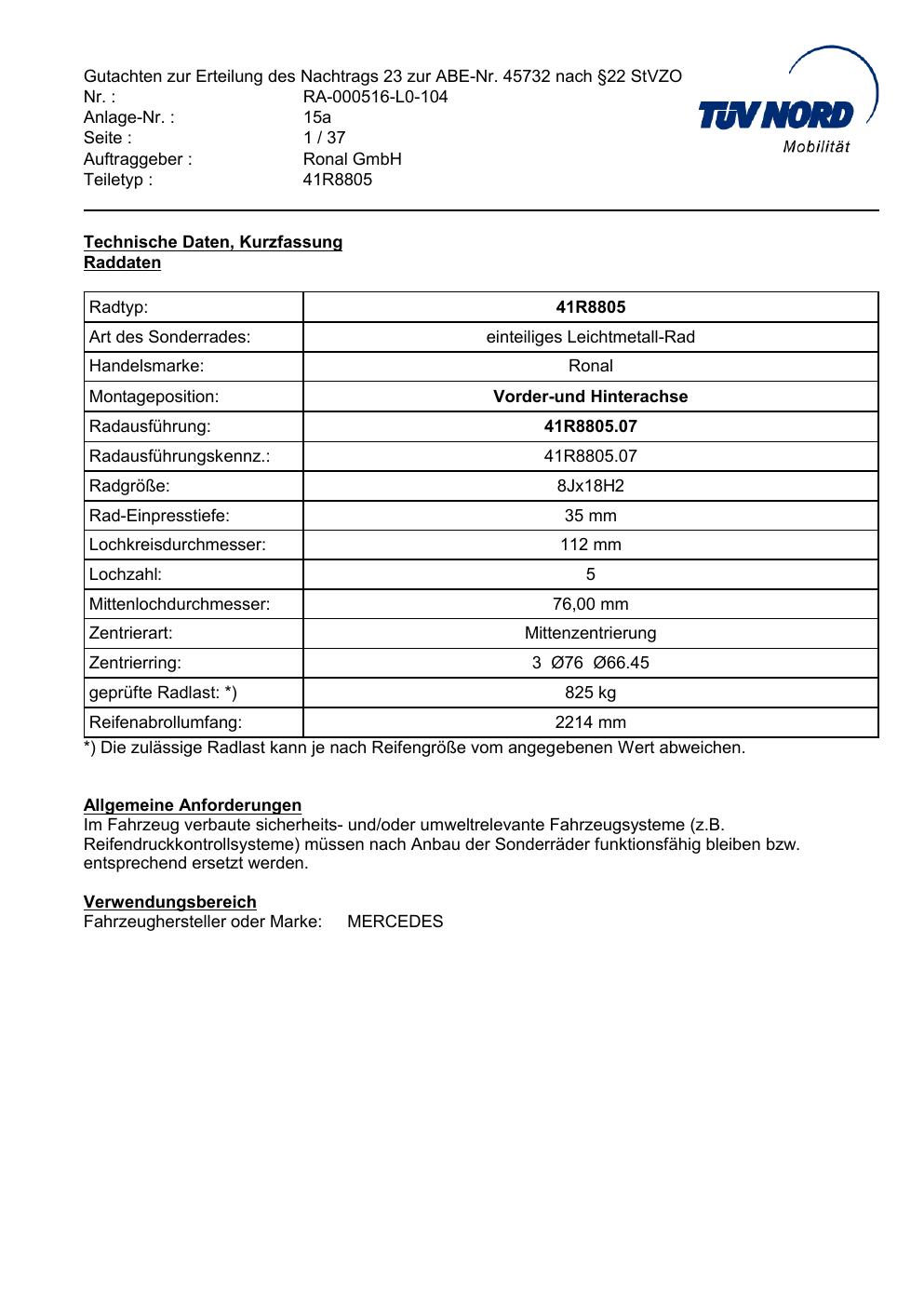 Dieses Gutachten (abe) bezieht sich auf die Alufelge brand-ronal 41R8805 in der Ausführung 8Jx18 ET 0, Mittenloch 0 mm (KBA 45732). Im PDF findest du typischerweise zulässige Reifengrößen, Auflagen/Anbauhinweise und – je nach Dokument – Hinweise zur Eintragung.