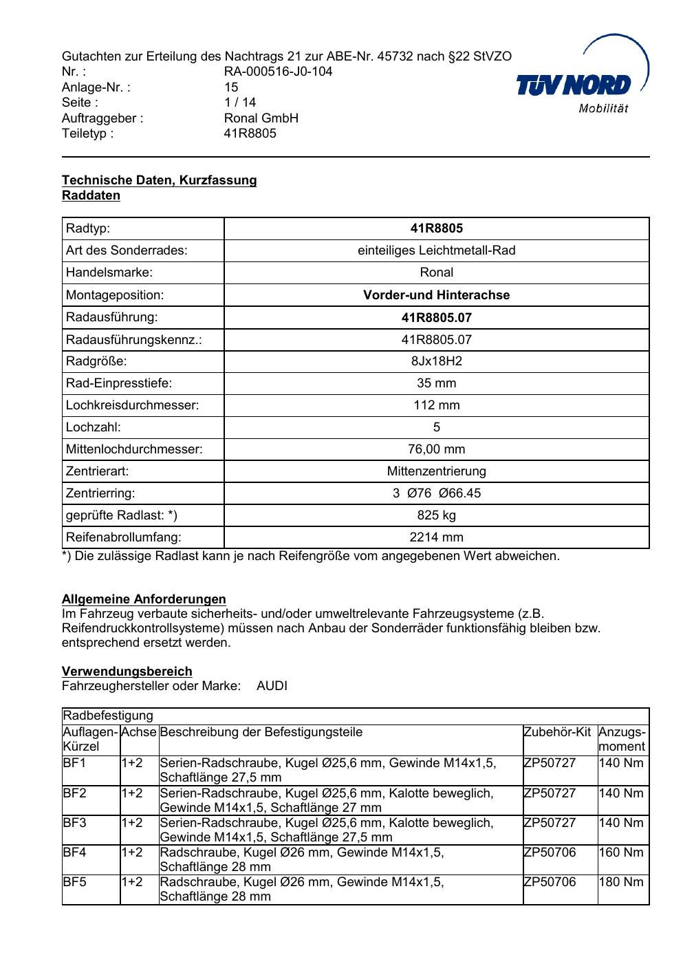 Dieses Gutachten (abe) bezieht sich auf die Alufelge brand-ronal 41R8805 in der Ausführung 8Jx18 ET 0, Mittenloch 0 mm (KBA 45732). Im PDF findest du typischerweise zulässige Reifengrößen, Auflagen/Anbauhinweise und – je nach Dokument – Hinweise zur Eintragung.