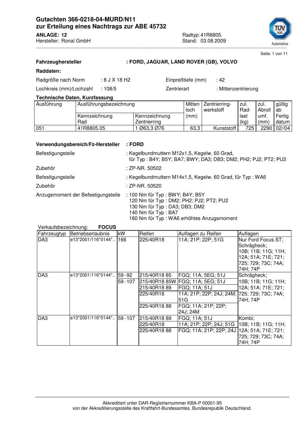 Dieses Gutachten (abe) bezieht sich auf die Alufelge Ronal 41R8805 in der Ausführung 8Jx18 ET 0, Mittenloch 0 mm (KBA 45732). Im PDF findest du typischerweise zulässige Reifengrößen, Auflagen/Anbauhinweise und – je nach Dokument – Hinweise zur Eintragung.
