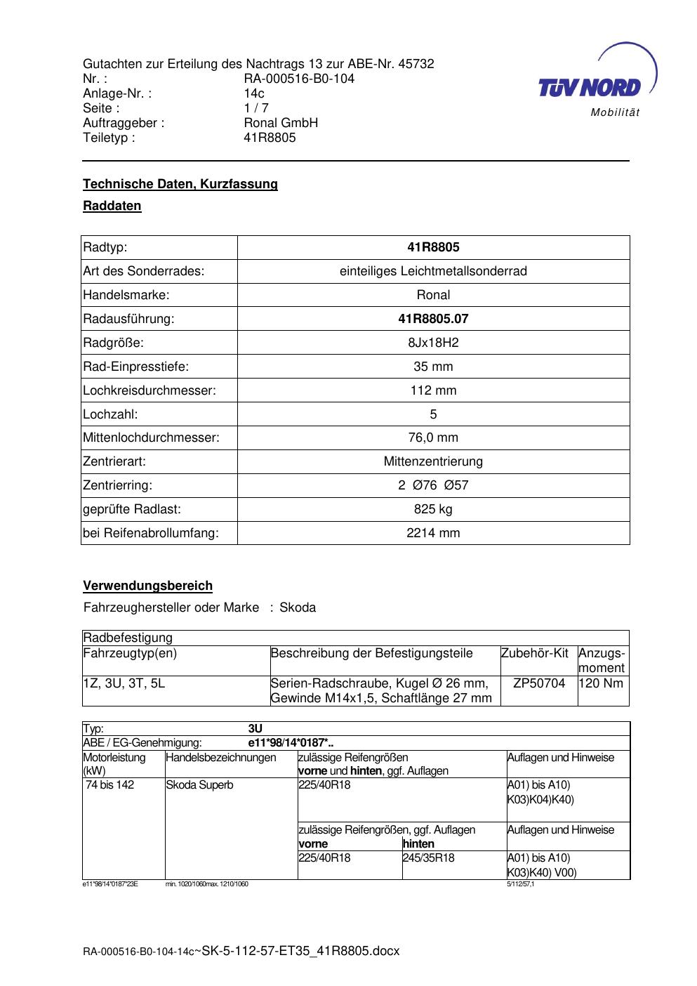 Dieses Gutachten (abe) bezieht sich auf die Alufelge brand-ronal 41R8805 in der Ausführung 8Jx18 ET 0, Mittenloch 0 mm (KBA 45732). Im PDF findest du typischerweise zulässige Reifengrößen, Auflagen/Anbauhinweise und – je nach Dokument – Hinweise zur Eintragung.