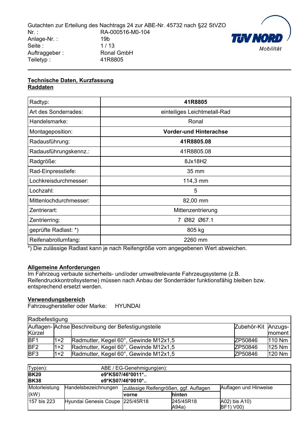 Dieses Gutachten (abe) bezieht sich auf die Alufelge brand-ronal 41R8805 in der Ausführung 8Jx18 ET 0, Mittenloch 0 mm (KBA 45732). Im PDF findest du typischerweise zulässige Reifengrößen, Auflagen/Anbauhinweise und – je nach Dokument – Hinweise zur Eintragung.