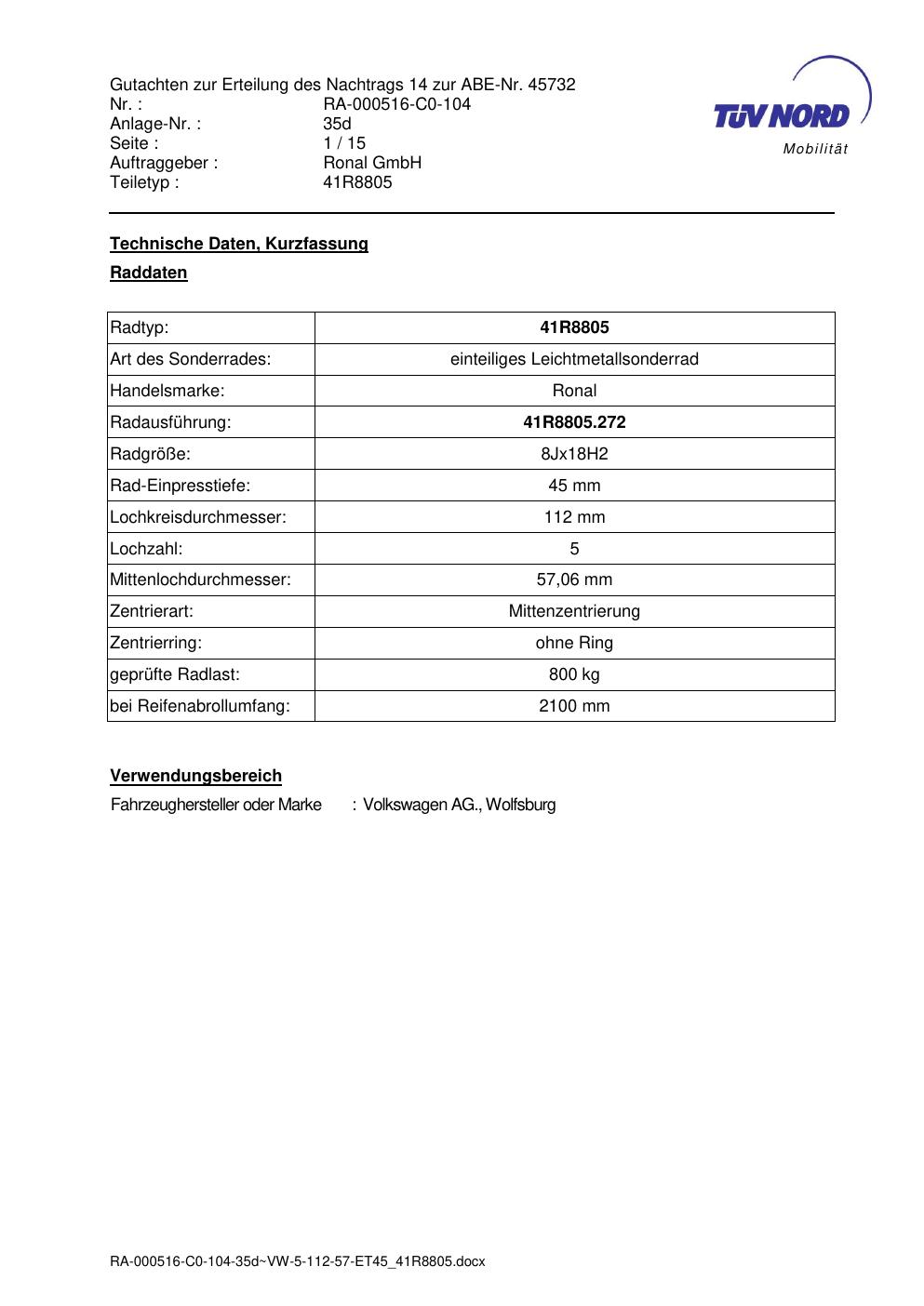 Dieses Gutachten (abe) bezieht sich auf die Alufelge brand-ronal 41R8805 in der Ausführung 8Jx18 ET 0, Mittenloch 0 mm (KBA 45732). Im PDF findest du typischerweise zulässige Reifengrößen, Auflagen/Anbauhinweise und – je nach Dokument – Hinweise zur Eintragung.