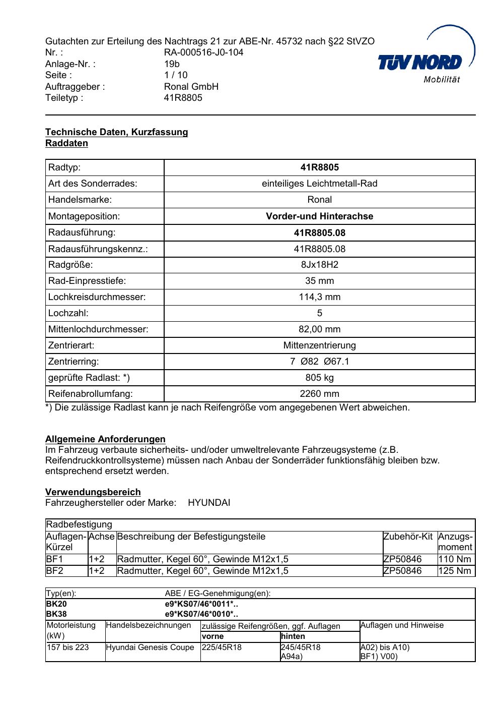 Dieses Gutachten (abe) bezieht sich auf die Alufelge brand-ronal 41R8805 in der Ausführung 8Jx18 ET 0, Mittenloch 0 mm (KBA 45732). Im PDF findest du typischerweise zulässige Reifengrößen, Auflagen/Anbauhinweise und – je nach Dokument – Hinweise zur Eintragung.