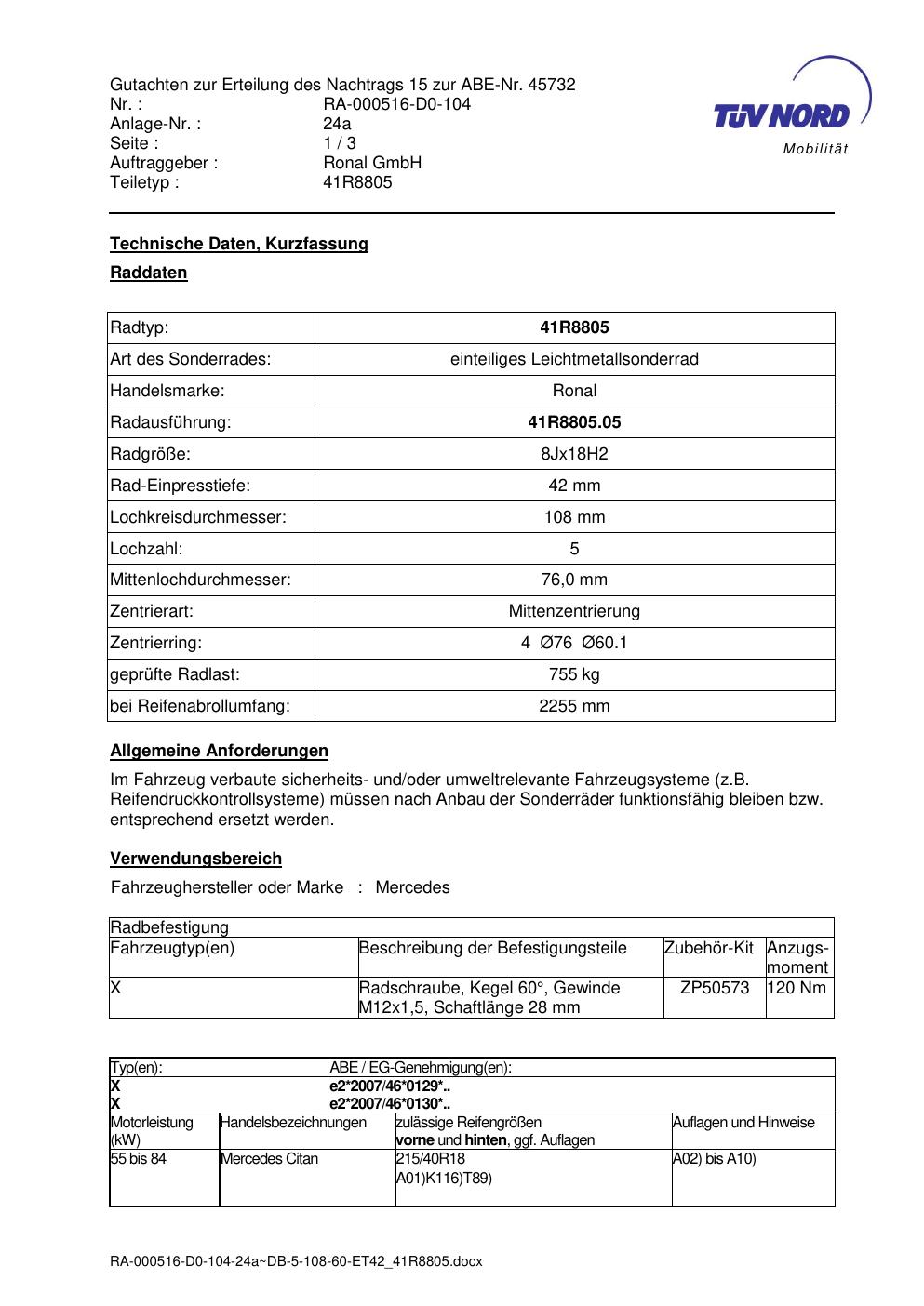 Dieses Gutachten (abe) bezieht sich auf die Alufelge brand-ronal 41R8805 in der Ausführung 8Jx18 ET 0, Mittenloch 0 mm (KBA 45732). Im PDF findest du typischerweise zulässige Reifengrößen, Auflagen/Anbauhinweise und – je nach Dokument – Hinweise zur Eintragung.