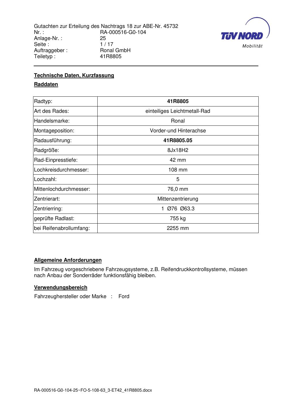 Dieses Gutachten (abe) bezieht sich auf die Alufelge brand-ronal 41R8805 in der Ausführung 8Jx18 ET 0, Mittenloch 0 mm (KBA 45732). Im PDF findest du typischerweise zulässige Reifengrößen, Auflagen/Anbauhinweise und – je nach Dokument – Hinweise zur Eintragung.