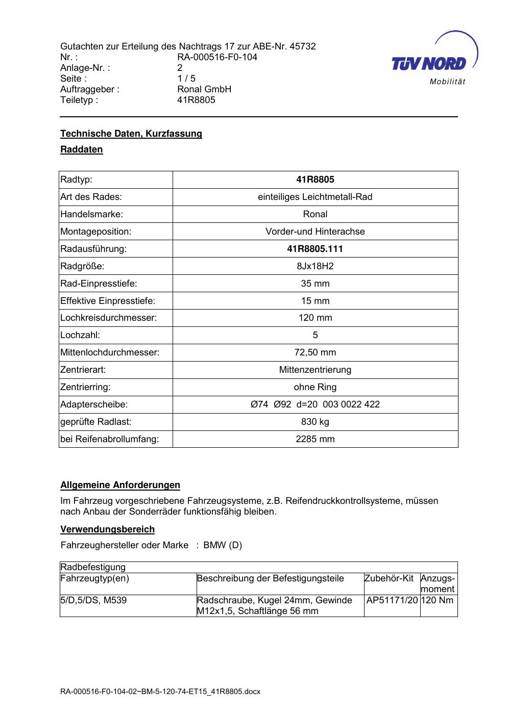 Dieses Gutachten (abe) bezieht sich auf die Alufelge brand-ronal 41R8805 in der Ausführung 8Jx18 ET 0, Mittenloch 0 mm (KBA 45732). Im PDF findest du typischerweise zulässige Reifengrößen, Auflagen/Anbauhinweise und – je nach Dokument – Hinweise zur Eintragung.