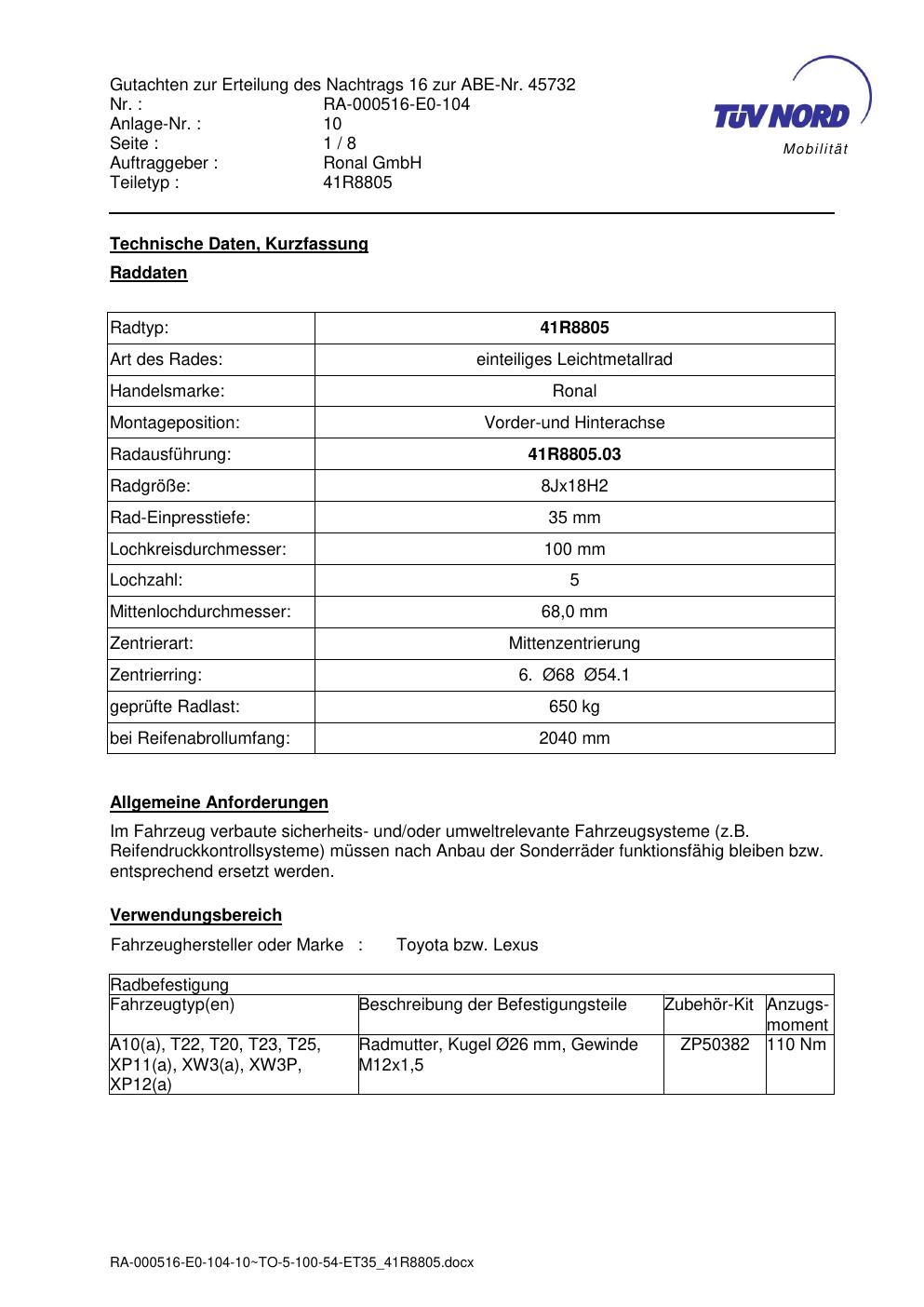 Dieses Gutachten (abe) bezieht sich auf die Alufelge brand-ronal 41R8805 in der Ausführung 8Jx18 ET 0, Mittenloch 0 mm (KBA 45732). Im PDF findest du typischerweise zulässige Reifengrößen, Auflagen/Anbauhinweise und – je nach Dokument – Hinweise zur Eintragung.