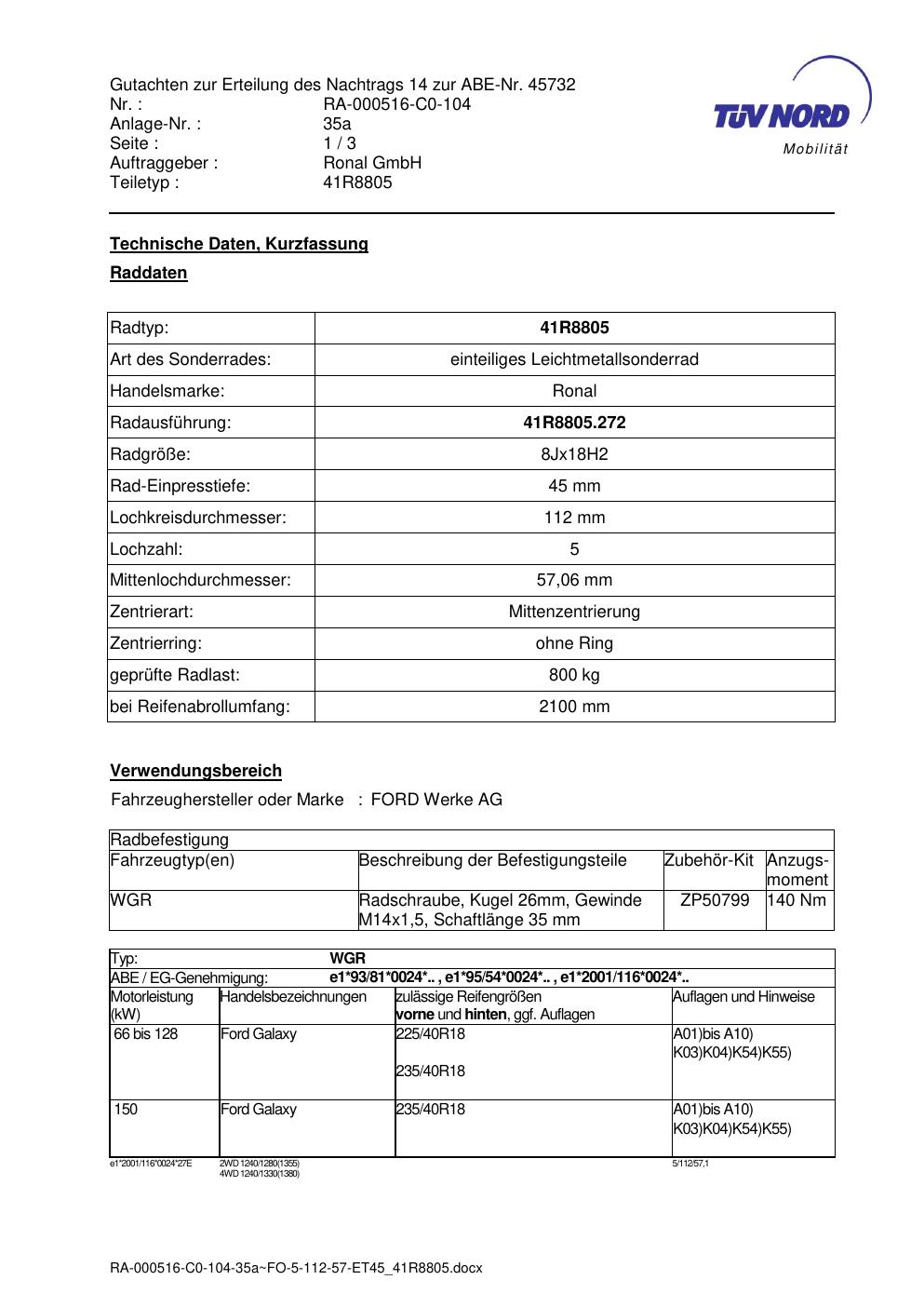 Dieses Gutachten (abe) bezieht sich auf die Alufelge brand-ronal 41R8805 in der Ausführung 8Jx18 ET 0, Mittenloch 0 mm (KBA 45732). Im PDF findest du typischerweise zulässige Reifengrößen, Auflagen/Anbauhinweise und – je nach Dokument – Hinweise zur Eintragung.