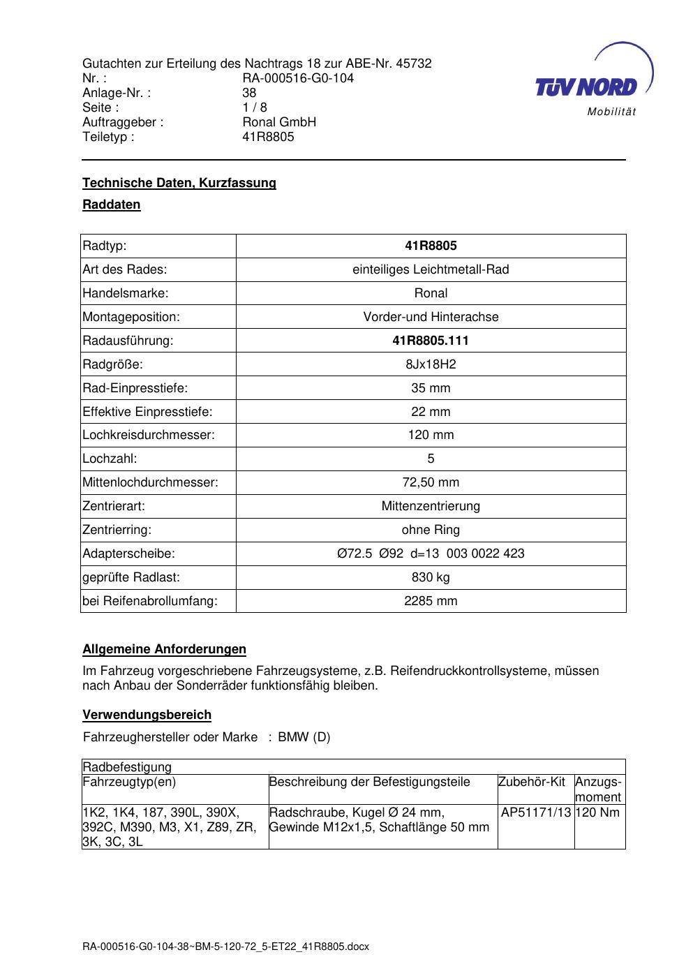 Dieses Gutachten (abe) bezieht sich auf die Alufelge brand-ronal 41R8805 in der Ausführung 8Jx18 ET 0, Mittenloch 0 mm (KBA 45732). Im PDF findest du typischerweise zulässige Reifengrößen, Auflagen/Anbauhinweise und – je nach Dokument – Hinweise zur Eintragung.