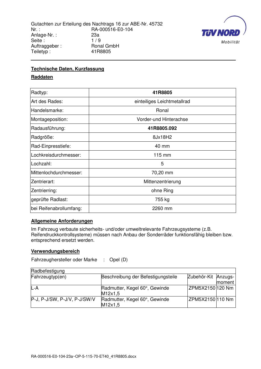 Dieses Gutachten (abe) bezieht sich auf die Alufelge brand-ronal 41R8805 in der Ausführung 8Jx18 ET 0, Mittenloch 0 mm (KBA 45732). Im PDF findest du typischerweise zulässige Reifengrößen, Auflagen/Anbauhinweise und – je nach Dokument – Hinweise zur Eintragung.