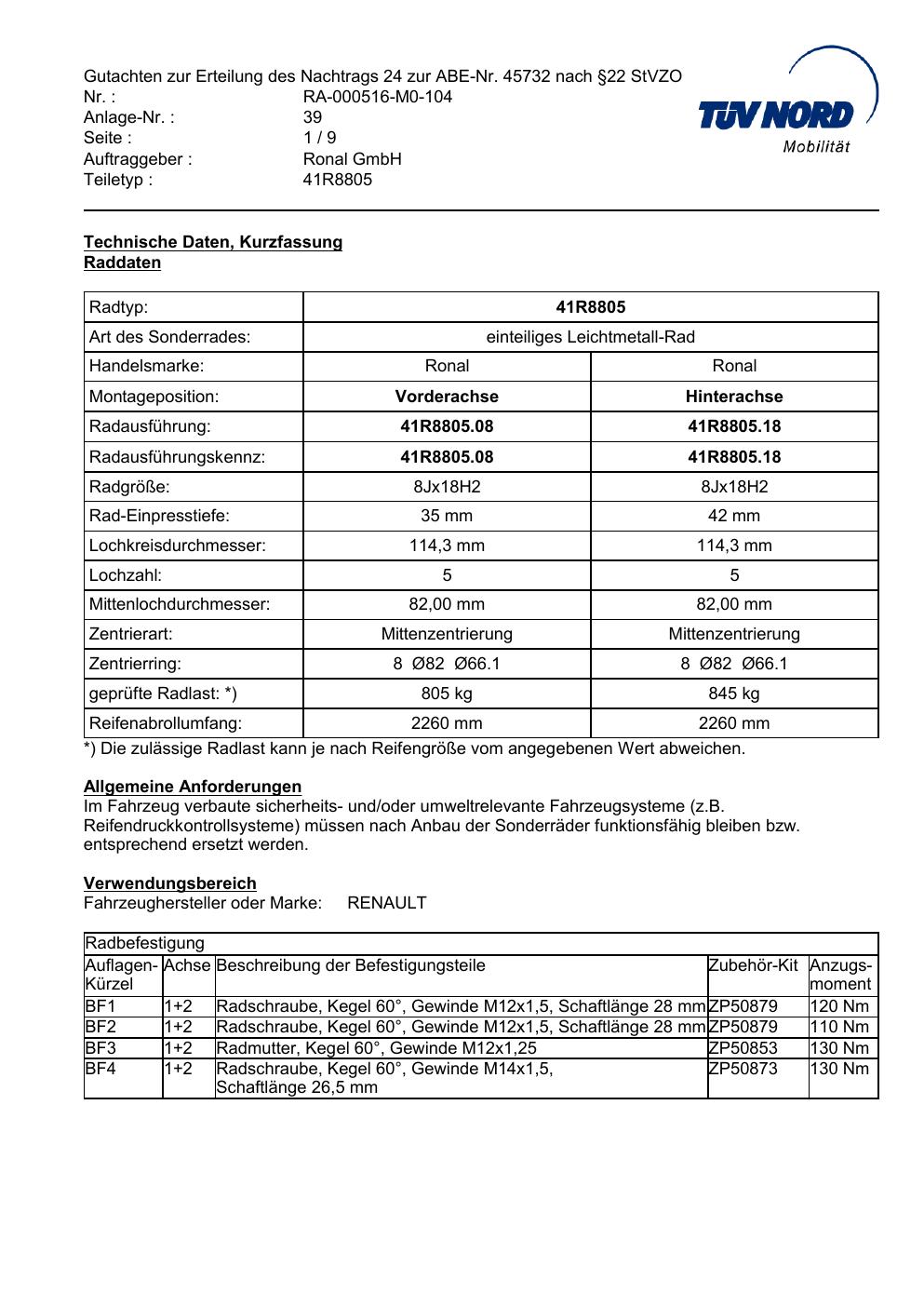 Dieses Gutachten (abe) bezieht sich auf die Alufelge brand-ronal 41R8805 in der Ausführung 8Jx18 ET 0, Mittenloch 0 mm (KBA 45732). Im PDF findest du typischerweise zulässige Reifengrößen, Auflagen/Anbauhinweise und – je nach Dokument – Hinweise zur Eintragung.